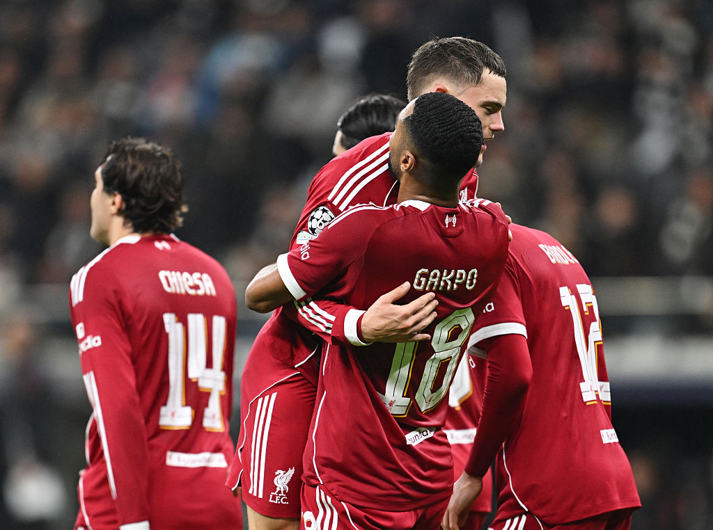 FRANKFURT AM MAIN, GERMANY - OCTOBER 22: Cody Gakpo of Liverpool celebrates scoring his team's fourth goal with teammate Florian Wirtz during the UEFA Champions League 2025/26 League Phase MD3 match between Eintracht Frankfurt and Liverpool FC at Frankfurt Stadion on October 22, 2025 in Frankfurt am Main, Germany. (Photo by Christian Kaspar-Bartke/Getty Images)