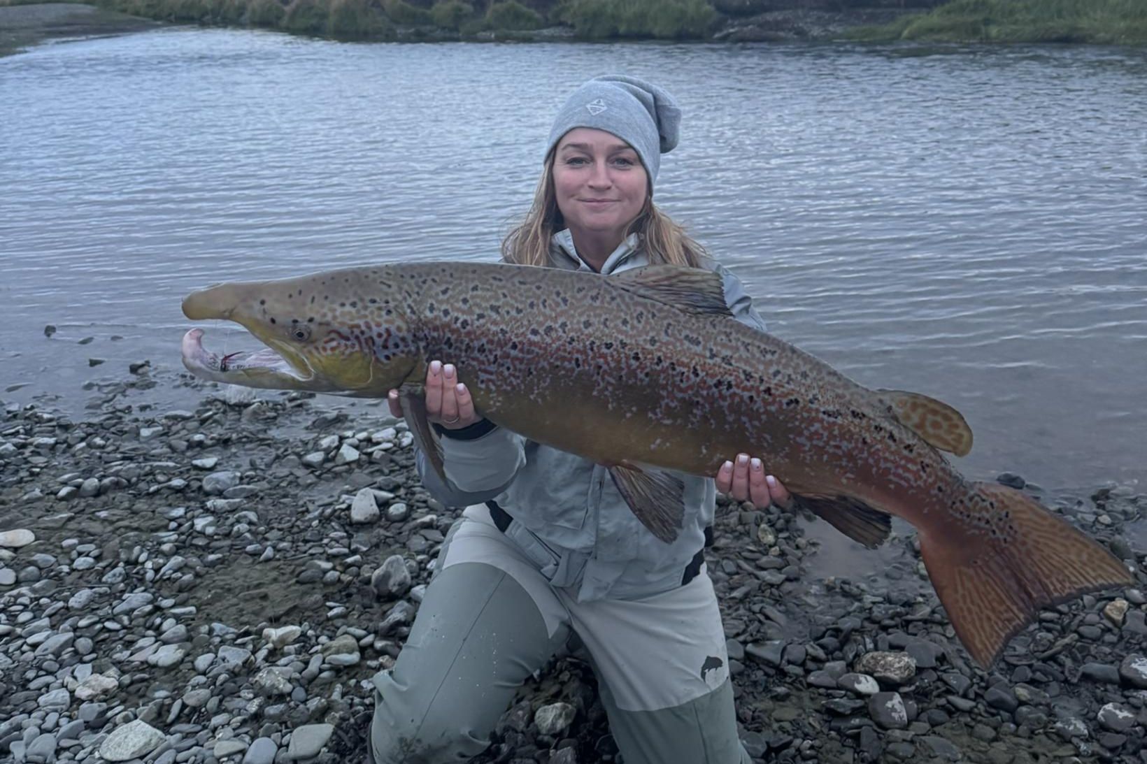 Í síðustu helgi tók Eyrún Ýr Guðmundsdóttir þátt í veiðiferð í Miðá í Dölum. Hún hafði ekki trú á að veiða fisk í ferðinni en allt breyttist þegar hún veiddi sinn fyrsta flugulax sem mældist hundrað sentímetrar.