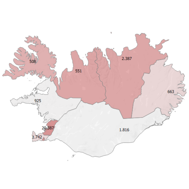 Fjölgunin var mest á höfuðborgarsvæðinu, þar sem 491 nýtt stöðugildi bættist, aðallega vegna Landspítala, Heilsugæslu höfuðborgarsvæðisins og Háskóla Íslands. Aftur á móti var hlutfallslega mest fjölgun stöðugilda á Vestfjörðum, sem nam 6,5%, en þessi aukning átti sér aðallega stað í Ísafirði. Mesta fækkun stöðugilda var hins vegar á Suðurlandi, þar sem 36 stöðugildi voru lögð niður, jafngildir 2,0% fækkun.