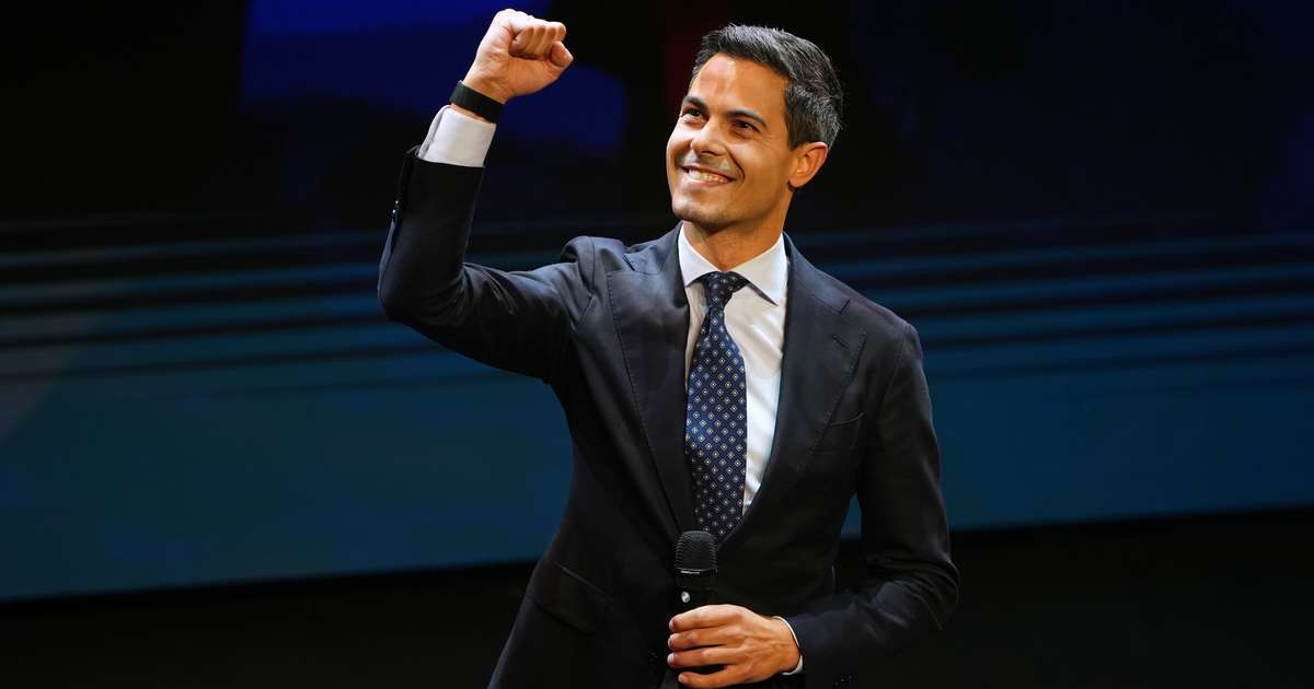 Rob Jetten, leader of the center-left D66 party, speaks on stage during exit poll results an election venue during a general election in Leiden, Netherlands, Wednesday, Oct. 29, 2025. (AP Photo/Peter Dejong)